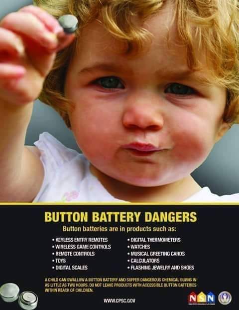 Se avete un bambino e non ci pensate due volte a dargli in mano le chiavi dell'auto con il comando a distanza, non fatelo più. Se gli lasciate in mano il telecomando della tv o altri comandi, ma anche minicalcolatori, candele decorative elettriche, insomma qualsiasi apparecchio azionato da queste batterie, almeno assicuratevi che lo scomparto che le contiene sia fermamente sigillato. La loro ingestione può essere mortale. Si tratta di pile dalla carica elettrica molto forte che se si fermano nell'esofago scaricano tutta l'energia sulle pareti corrodendole come fosse una sostanza caustica. Si rischia che si formi una fistola nella trachea o, ancora peggio una fistola con l'aorta provocando la morte del bambino in pochi minuti. Vi sono sintomi particolari che possono far temere l'ingestione di una batteria al litio: sete e salivazione eccessiva, rifiuto per il cibo e la concomitanza della sparizione di questi particolari oggetti.